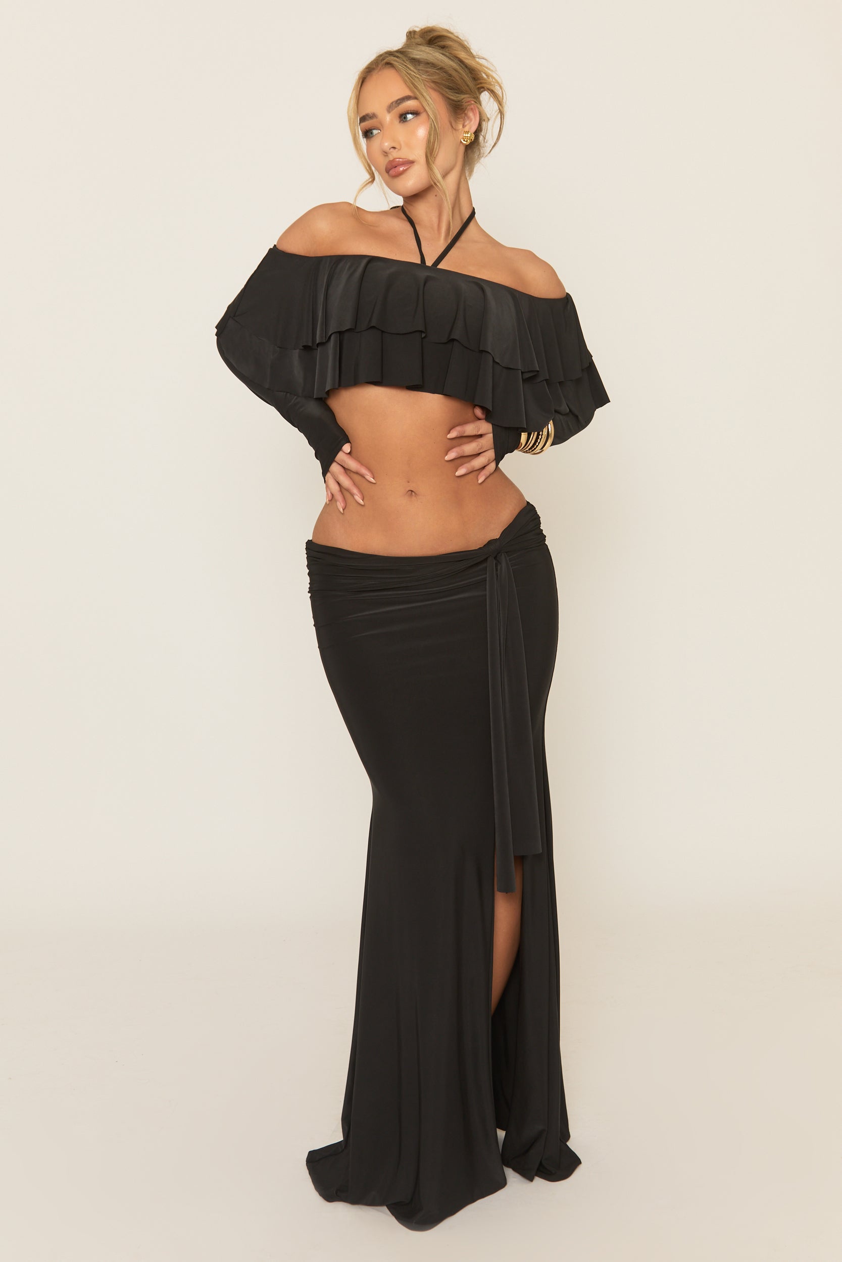 Black Ruffle Bardot Long Sleeve Top and Maxi Skirt Co-ord Set